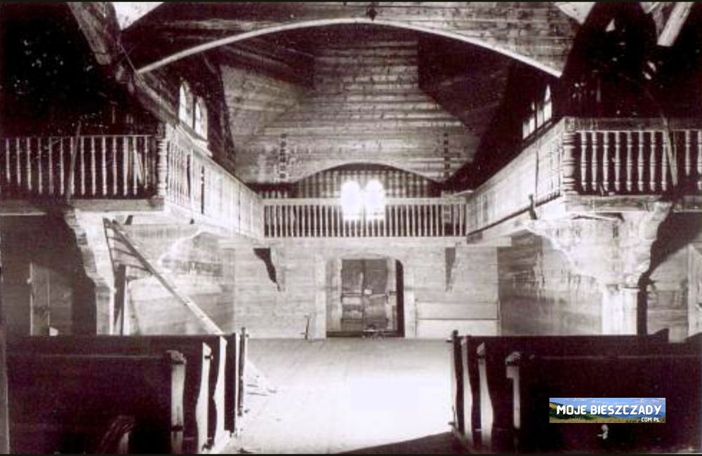 Świątynia była zrębowa, z łączeniem „na rybi ogon” — masywna podstawa ścian, wewnątrz zaś widoczne ostatki i rysie konstrukcyjne. Wewnątrz przestrzenie prezbiterium, nawy i babińca zamknięte były sklepieniami zrębowymi (kopuły zrębowe), natomiast ramiona transeptu i zakrystii nakryte sufitami deskowymi. Centralna przestrzeń wnętrza była podzielona arkadami o łukach odcinkowych, spływającymi na listewkowe głowice imitujące pilastry — rozwiązanie, które łączyło funkcję konstrukcyjną z dekoracją. Nad babińcem i zachodnią ścianą transeptu znajdował się chór muzyczny wsparty na rysiach, dostępny ze skromnego przedsionka.