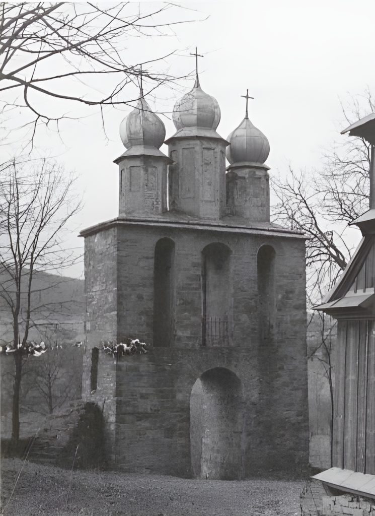 Po zachodniej stronie ogrodzenia znajduje się dzwonnica parawanowa – dwukondygnacyjna, z przejazdem w dolnej części i sklepioną, potrójną arkadą na piętrze. Zwieńczona jest trzema ośmiobocznymi hełmami z krzyżami łacińskimi, z których centralny jest największy. Konstrukcja wykonana została z kamienia łamanego i cegły, co odróżnia ją od drewnianej cerkwi.