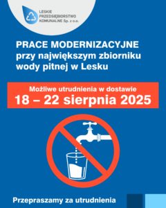 W dniach 18–22 sierpnia 2025 roku w Lesku prowadzone będą prace modernizacyjne w największym zbiorniku wody pitnej przy ul. Szopena. Zakres robót obejmie czyszczenie zbiornika, uszczelnienie konstrukcji oraz wymianę armatury.